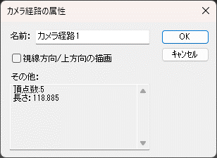 「カメラ経路」は、カメラの移動する経路を表す図形です。「操作」→「視点」→「ウォークスルーアニメーション」メニューで用いられます。