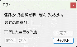 現在選択されている曲線数を表示します。はじめから2つ以上(”閉じた曲面を作成”にはじめからチェックが入っている場合は3つ以上)の曲線を選択してこの操作を実行した場合は、この曲線数に0より大きな数が表示され、そのまま完了ボタンを押して、曲面が作成されるようになっています。その際に、選択された曲線を結ぶ順番は自動的に計算されるため、結果の曲面が意図しない形状になることがあります。その場合は、複数の曲線を選択してロフトを実行するのではなく、ロフトのなかで一本一本の曲線を順に選択して下さい。