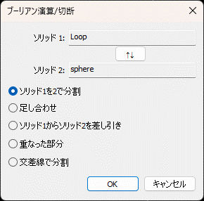 ソリッド同士で足し算・引き算・重なった部分を取り出したり、ソリッドをシェルで切断したり、複数シェルで、相互の交差線で切断したりします。3つ以上のシェル/ソリッドが選択されている場合は、相互切断のみが行えます。