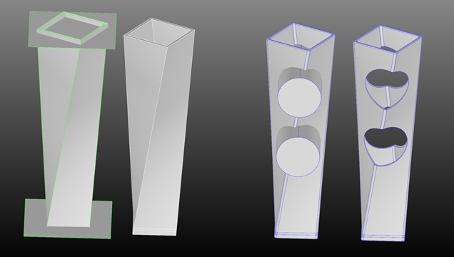 また、右から2番目で、縦に長い形状から円柱のソリッドを2つ差し引くことで、一番右の形状にしました。