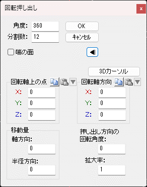 回転押し出しの中心となる軸が通る一点とその方向を指定します。画面上で二点左クリックすることで、一点目が回転軸の通る点に入力され、一点目から二点目にいたる方向が回転軸方向として入力されます。点の入力は、「設定」→「点のピック」メニューに従って行われます。また、"3Dカーソル"ボタンを押すことで、3Dカーソルの位置とZ軸方向が回転軸として入力されます。