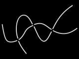 交差計算 選択された線分、ポリライン、曲線、円弧の間で重なっている場所に頂点を作成し、それぞれを複数の図形に分割します。 例: 操作前の二本の曲線です。 交差計算により、切り離されて出来た八本の曲線です。