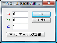 軸に垂直な平面(XY平面、YZ平面、ZX平面)のうち、視線方向ともっとも角度のつく平面が、マウスによる移動平面として自動的に選択されます。例えば視線方向がほぼ真上から(ほぼZ軸正から負に向けて)であれば、XY平面がマウスによる移動平面となります。