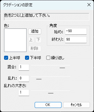 二つ以上の色を追加ボタンで追加します。これらの色が滑らかに補間されて背景の色となります。上、下のボタンで、指定の色を上または下に移動します。削除ボタンで指定の色を削除します。また、追加した色をダブルクリックすることで、色を変えることができます。