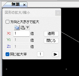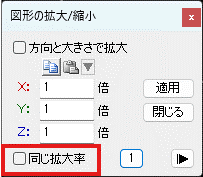 8.画面の左上のウインドウで、”同じ拡大率”のチェックを外してください。それにより、図形をX、Y、Z軸方向で別々に拡大・縮小できます。
