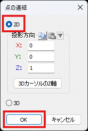 「図形編集」→「点の連結」メニューを実行します。ウインドウが表示されるので、”2D”を選択してOKボタンを押します。