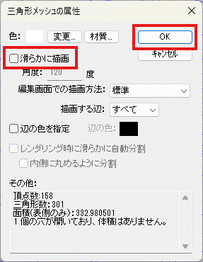 ボタンを押します。”三角形メッシュの属性”設定画面が表示されるので、”滑らかに描画”のチェックを外し、OKボタンを押します。