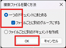 下のウインドウが表示されるので、上の”一つのドキュメントにまとめる”を選択し、”ファイルごとに別のグループにする”にチェックを入れてOKボタンを押します。