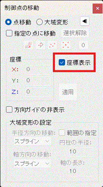 ボタンを押します。左上に表示されているウインドウで右上の右三角ボタンをクリックし、ウインドウを大きくし、座標表示にチェックを入れて下さい。これによって選択した制御点の座標が表示されるようになります。