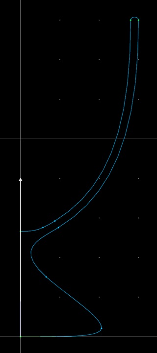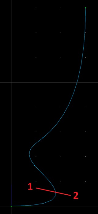 一番下と下から2番目の制御点が、コップの内側の底を形作ります。Y座標を0にしたのは、後で回転押し出しするときに、内側に穴が生じないようにするためです。またZ軸座標をあわせたのは、内側の底の中心が尖ったり、くぼみが生じたりしないようにするためです。