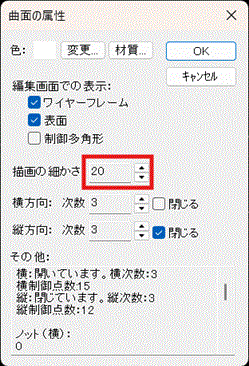 ボタンを押して下さい。曲面の属性を変えるためのウインドウが表示されます。描画の細かさを20程度に増やし、OKボタンを押してください。