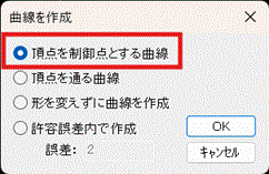 一番上の「頂点を制御点とする曲線」を選択してOKボタンを押して下さい。ポリラインが曲線になります。(ここ以降は見やすいように、「設定」→「編集画面の環境設定」メニューの「色」タブで、選択された図形の色を明るい色に変えています。)