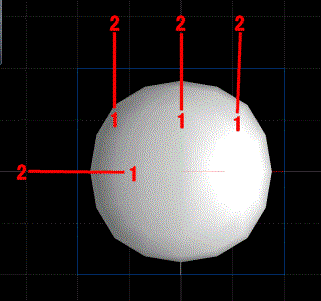 細分割曲面に、指の元となる切れ目を入れます。”T”キーを押して、図形を真上から見て下さい。図形の上の部分を4つに(親指以外の指の元となります。)、左の部分を二つに(親指の元となります。)、分割します。