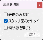 図形に4ヵ所の切れ目を入れます。1点目を左クリックし、2点目を左ダブルクリックすればその位置に切れ目が入り、図形の側面が複数の面に分かれます。1点目を左クリックした後でShiftボタンを押すと、切断線が画面0,45,90度方向に固定できます。また、左上のウインドウで”スケッチ面のグリッド”にチェックを入れると、スケッチ面のグリッド上をクリックでき、きれいに切断しやすくなります。