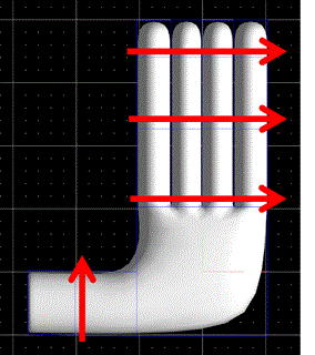 親指の大体の長さを整えます。画面上でマウスを左ドラッグすると、この部分が押し出されます。(画面上に表示されるコントローラーの各座標軸の上をマウスでドラッグすれば、その方向に沿って押し出されるため、細かく調整するのに便利です。)