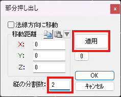 この部分を押し出します。「細分割曲面」→「押し出し」メニューを選択して下さい。下のダイアログが表示されるので、”法線方向に移動”にチェックを入れ、縦の分割数に2を入れて、”適用”ボタンを押して下さい。