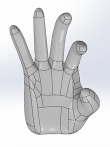 「細分割曲面」→「ソリッド/シェル生成」メニューを実行してください。手の形状をしたソリッドが作成されます。(細分割曲面を、三次元CADで使われるNURBS曲面で近似しているため、少し形が異なります。細分割曲面の属性で”ソリッド/シェル用の曲面で近似”にチェックを入れると、常にNURBS曲面で近似した結果を表示するようになりますが、少し重くなります。)