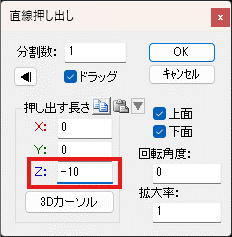 ポリラインを押し出します。ポリラインを選択し、「図形編集」→「点/線の押し出し」→「直線押し出し」メニューを実行します。左上のウインドウで、横三角ボタンを押してウインドウを広げ、”押し出す長さ”のZ値に-10を入力してOKボタンを押します。ポリラインに厚みがつき、三角形メッシュになります。