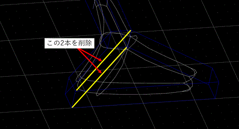 11と同じ操作で、押し出した三角形メッシュを細分割曲面に変更します。そのままでは左右対称の形状になっていないので、細分割曲面の辺を一部削除します。「細分割曲面」→「辺の追加/削除」メニューを実行します。細分割曲面で、左右対称になっていない部分の辺を右クリックし、削除します。(10と同じ操作で細分割曲面部のみを表示すると操作しやすくなります。)