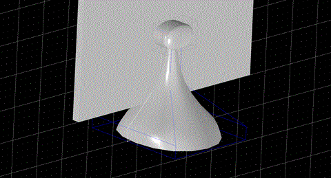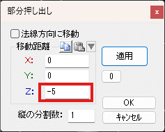 その後、「図形編集」→「三角形メッシュの部分」→「押し出し」メニューを実行します。左上に表示されたウインドウのZに-5を入力し。OKボタンを押します。直方体の一部が押し出されます。
