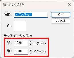 表示された”テクスチャの選択”ウインドウで、”作成”ボタンを押します。表示された”新しいテクスチャ”ウインドウで、”テクスチャの大きさに1920、1080を指定してOKボタンを押します。