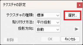 ”テクスチャの選択”ウインドウでもOKボタンを押します。その後、”テクスチャの設定”ウインドウの”投影方向”を”自動”に設定し、OKボタンを押します。これで液晶画面にテクスチャ(白一色)が貼られました。