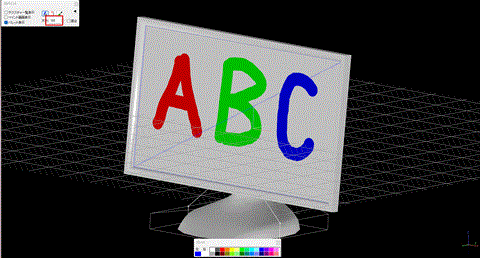 液晶部分が選択された状態で、「図形編集」→「材質/テクスチャ」→「3Dペイント」メニューを実行します。左上の”3Dペイント”ウインドウの”太さ”に100を設定し、液晶部分の上をドラッグしてテクスチャを描画します。下の”パレット”からペンの色を選択できます。また、上のツールバーの
