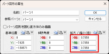ボタンを押します(または[「図形編集」→「属性]メニューを実行します)。”パーツ図形の属性”ウインドウが表示されるので、”拡大/縮小”のところのXYZすべてに3.7358を入力し、OKボタンを押します。(現在の液晶部分の対角線の長さは(160×160+90×90)^0.5 = 183.575mm...であり、この長さが685.8mm(=27inch)になってほしいので、685.8/183.575=3.7358...倍になります。)