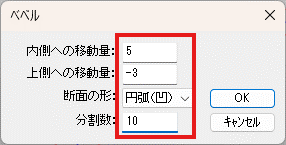 表示されるウインドウの”内側への移動量”に 5 を、”上側への移動量”に -3 を入れ、”断面の形”を’円弧(凹)’にして、”分割数”に10