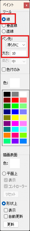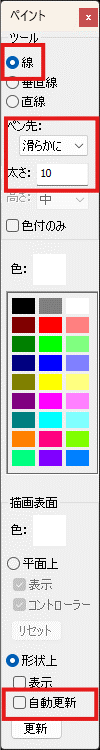 次に、左に表示されたウインドウで、「ツール」を「線」、「ペン先」を「滑らかに」にし、「太さ」に10を入れます。また、下の「自動更新」のチェックを外します。