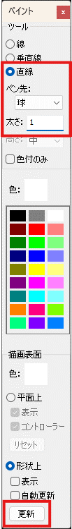 座面のくぼみを作成します。左に表示されたウインドウで、「ツール」を「直線」、「ペン先」を「球」にし、「太さ」に1を入れます。「更新」ボタンを押し、描画する形状表面を現在の形状で更新します。