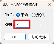 全体を滑らかにします。「特殊図形」→「ボリューム」→「凹凸を減らす」メニューを実行します。「強度」に2を入れ、OKボタンを押します。