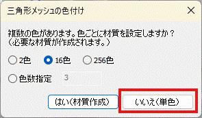 ボリュームから三角形メッシュを作成します。「特殊図形」→「ボリューム」→「三角形メッシュ作成」メニューメニューを実行します。”複数の色があります。”とのウインドウが表示されますが、白一色で描いていても、描かない場所の初期の色は黒(かつ完全に透明)で埋められているため、滑らかな形状表面を取り出す処理により、黒と白が混ざってグレー色が生じています。「いいえ(単色)」ボタンを押します。