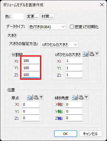 ボリュームを作成します。「特殊図形」→「ボリューム」→「直接作成」メニューを実行します。表示されるウインドウで、「大きさ」の中の「分割数」を、X、Y、Zすべてに100を指定し、OKボタンを押します。