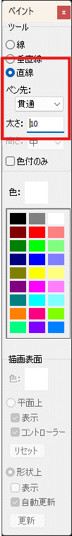 左に表示されたウインドウで、「ツール」を「直線」、「ペン先」を貫通にし、「太さ」に10を入れます。