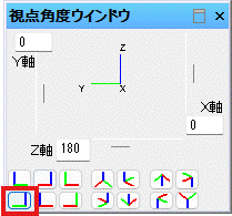 ボタンを押します。(または「表示」→「各種ウインドウ」→「視点角度ウインドウ」メニューを実行します。)表示された「視点角度ウインドウ」の一番左下のボタンを押します。