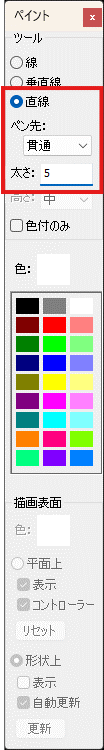 左に表示されたウインドウで、「ツール」を「直線」、「ペン先」を「貫通」にし、「太さ」に5を入れます。