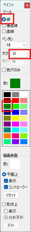左のウインドウで、「ツール」の「線」にチェックを入れ、太さを10にし、下の緑の四角を左クリックします。「色」が同じ緑になります。