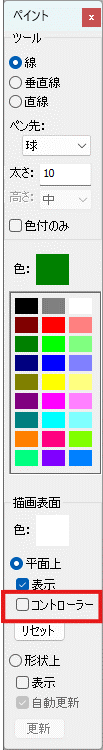 平面のコントローラーが描画の邪魔になる場合は、「コントローラー」のチェックを外すことで、コントローラーが非表示になります。