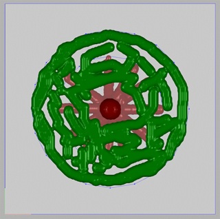 ボリュームから三角形メッシュを作成します。「特殊図形」→「ボリューム」→「三角形メッシュ作成」メニューを実行します。表示されたウインドウで、「2色」を選択し、「はい(材質作成)」ボタンを押します。三角形メッシュが作成されます。