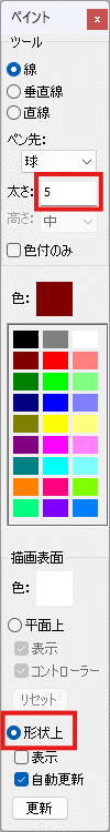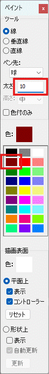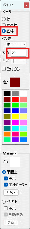 左のウインドウで、「太さ」に10を入れ、下の茶色の四角形を左クリックします。「色」の四角形が同じ茶色になります。これで、茶色の太さ10(ボクセル:ボリュームの分割単位)の線が描画できるようになります。