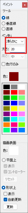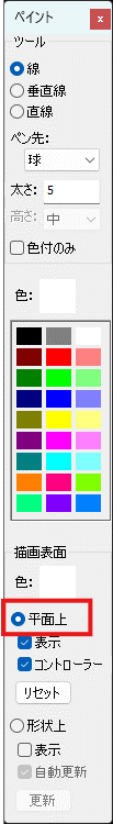 左にペイント用の縦長のウインドウが表示されます。そのウインドウの「描画表面」の「平面上」にチェックを入れます。