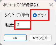 「タイプ」を「ガウス」、「強度」を2にしてOKボタンを押します。全体が滑らかになります。