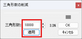 表示された「三角形数の削減の設定」ウインドウでそのままOKボタンを押すと、計算終了後に左上にウインドウが表示されます。「三角形数」に10000を入れ、「適用」ボタンを押してから、OKボタンを押します。三角形数が減少した三角形メッシュが作成されます。